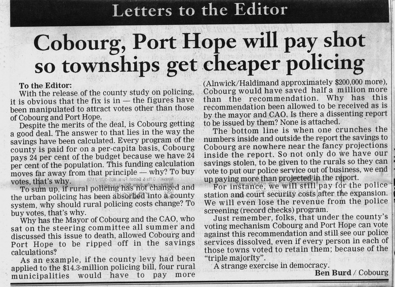 This police discussion is going to nasty before it gets better. The debate is going to boil down into whether Cobourg can influence it own destiny and how much money are we going to save? Here is a letter that I wrote this week that sums it up