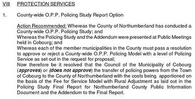 The question in the first para was asked by one of the two people who spoke in favour of the motion - shall we switch to the OPP. The other twenty odd speakers all spoke against the idea. For various reasons but mainly because of the fear of the unknown level of service that will replace the Cobourg Police Service. Most of the speakers either spoke from experience or quoted the experience of others and were not complimentary to the OPP level of service. Even Inspector Borton the Northumberland detachment Commander chose his words carefully and didn't commit to anything other than all complaints will be answered. The dispatchers spoke about the lack of local knowledge the OPP communications possess and question whether it would improve.