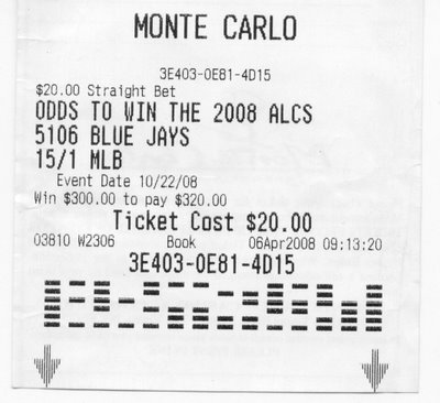 This is a small piece of whimsey, a dream that may be come true - a sure thing!On the last vacation this ticket was purchased as on a whim. However as it sat tucked away in my wallet it has been looked at from time to time as I wondered just how to spend the $300 win. Ten and a half games back the dream had expired - until yesterday. The Jays fired the managing staff and brought back retread Cito Gaston. Will it work? I hope so for I have a vested interest.