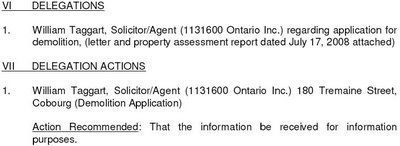 This is an item on the Council agenda for Monday evening. Mr Taggart is going to tell Council what his client thinks of the idea of roadblocks, imposed by Councils, on the property at Tremaine St. The old Cobourg Matting Company site is rundown, abandoned and sits in a floodplain. There is a plan to redevelop it with homes (what else!). However it appears by the wording of the agenda it doesn't matter what Mr Taggart and his client say, none of it will be acted on as the remarks, whatever they are, are already determined to be consigned to the official hiding place of limbo-land, known as "received for information". And, Council still doesn't understand why they are fading into political irrelevance in the eyes and ears of the voters.
