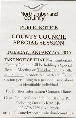 This intriguing announcement graced the pages of the Northumberland news today. I have never seen anything like this before so what personnel change is being contemplated at the County that couldn't wait until the next regular regular meeting?
