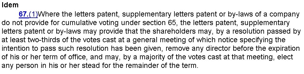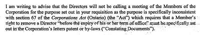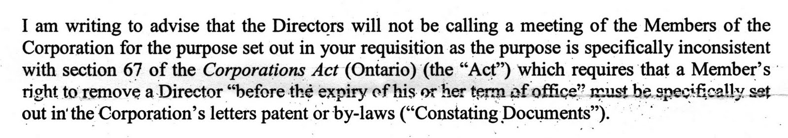 This naturally produced pushback and 10% of the members asked for a special meeting the subject being the removal of Directors. The present Directors obviously declared the 'requisition' not within the purview of the role of a member and refused to schedule a special meeting.