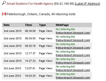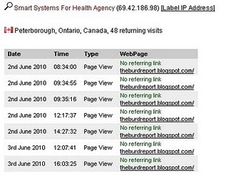 Now just who are these people - Smart Systems for Health Agency? They appeared in the tracking stats around the time the BurdReport started to expose the machinations of the Hospital Board. IP lookup tells me they are based in Peterborough, and as of this morning they have hit the site 48 times, five times yesterday alone. But what do they do?