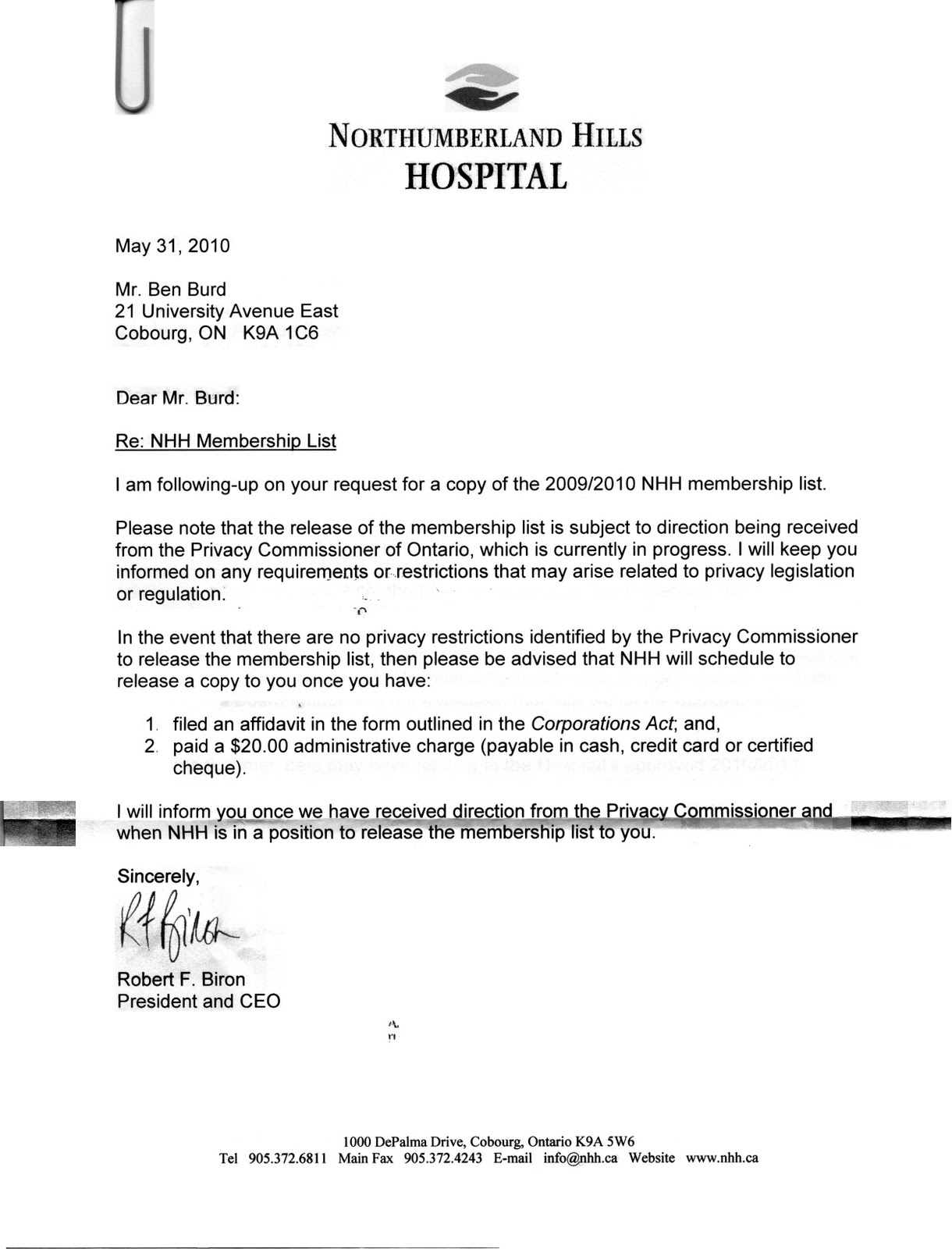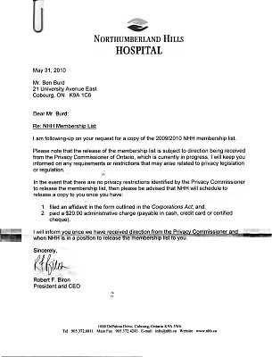 I too received the same 'bedbug' letter that Bridget Campion received from Mr Biron, about the request for an association membership list; her's was on display last evening. In that letter shown on the right, click on the image to enlarge, he said that the release of the list depended on a ruling from the Privacy Commissioner. So when I called the Privacy Commission to see if they had a request on file and how long it would take for a response Karen Hale, a Privacy Officer, asked me, "Why would we make such a ruling, hospitals are not subject to the freedom of Information Act (FOI)?"