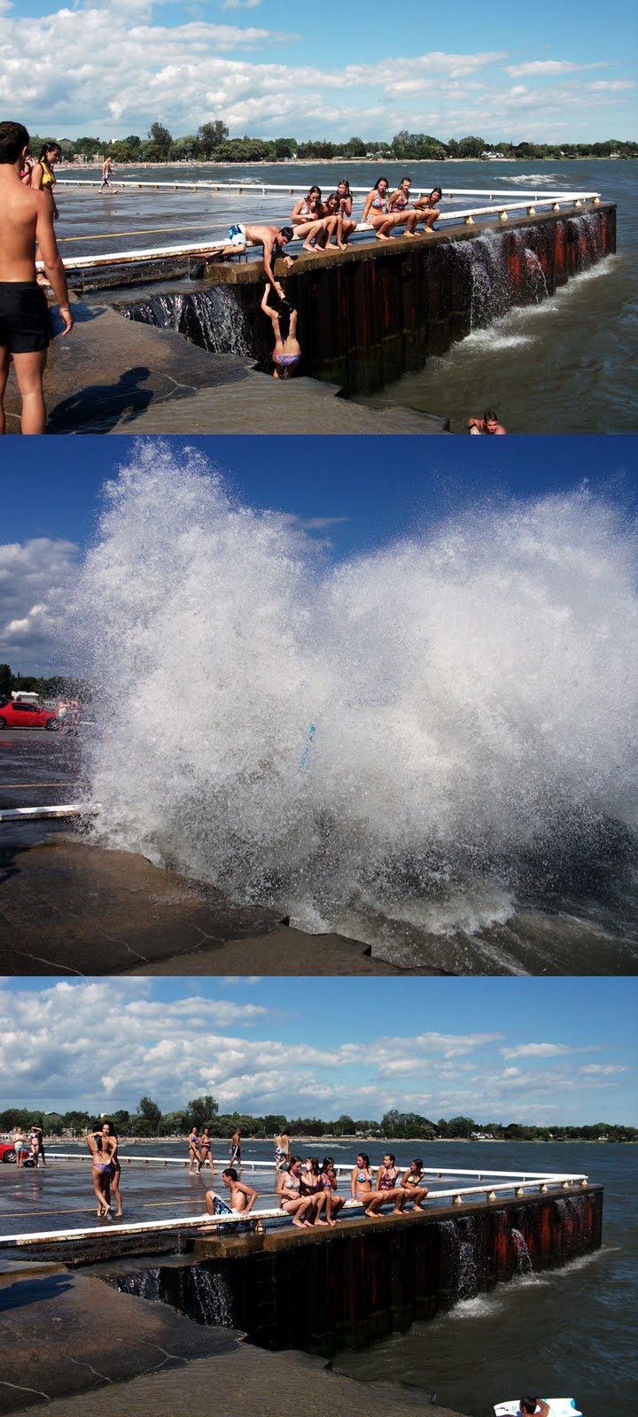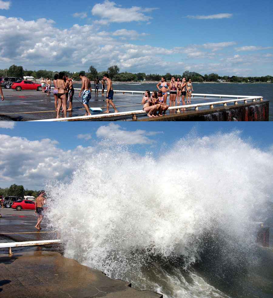 Occasional waves exploded two or three stories into the air, drenching girls who perched themselves, like sweet little seagulls, on the steel railing that perimeters the pier.