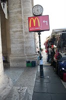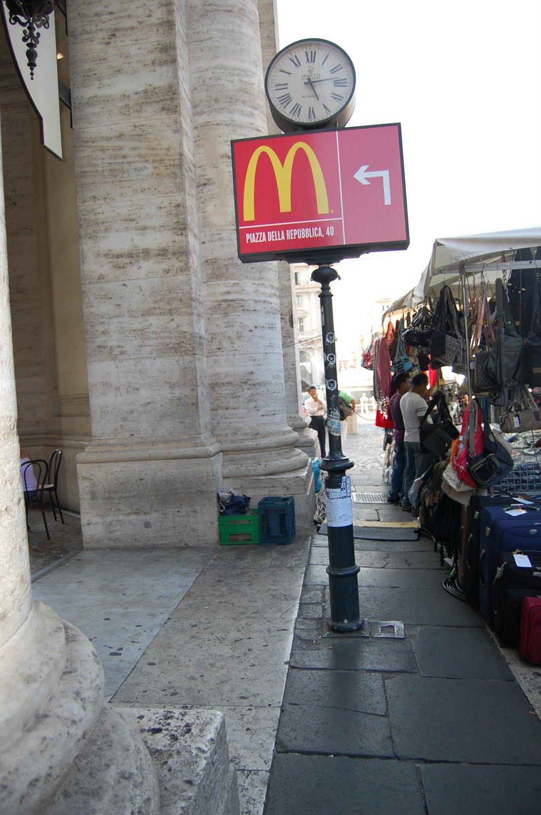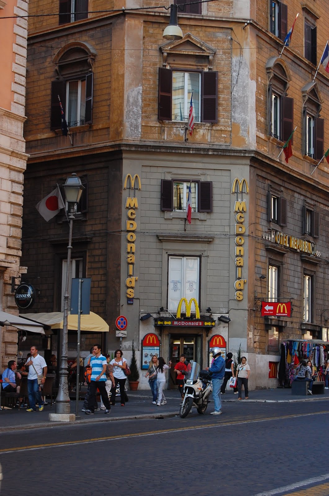 For example we, in North America have been bludgeoned by the fast food industry that large signs and a standardised building formula are absolutely essential for corporate existence. If that's the case why do the Italians put these stores in heritage buildings and mandate small signs?