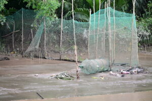 This boat trip was on a Mekong Delta tributary and had been, or still was in a limited capacity, an area of significant boat building. Boats on ramps and inside building facilities were still on the Delta banks. Also noted was the large number of crab traps. Set up to take advantage of the tides, the  fisherfolk would empty the nets at low tide after hoping to catch the crabs that walk on the banks at high tide.