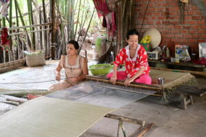 Then the river boat ride to the candy factory which uses the coconut meat to make various forms of coconut based candies. Naturally we bought a small sample for 50,000 dong – about $2.25cdn. Back on the boat we soon docked at a set of steps – no more clambering up rickety piers and walked to the ‘mat’ factory. Another tourist trap with good stuff. The object of this trip was to see how the bamboo sleeping mats, place mats and coasters are made – just like a carpet on a loom.