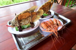 The ride to the next boat was on a six seater ‘TukTuk’ basically a motor-cycle front end with a wide axled fixed platform that can be filled with people, goods and anything else that needs to be transported on small roads. Getting to the last boat we discovered that it was a four-seater rowboat paddled by the helmsman who stands up to paddle. Little rocky but still safe. This was the transport to the lunch. The lunch being the most impressive of the trip – two full sized cooked fish complete with heads and super big prawns, with the usual soup and rice; wonderful.