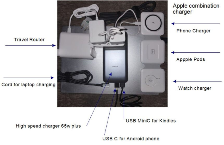 A look at my efforts to ‘downsize’ my electronic needs. This pic shows one charger and its many uses for all of our devices.